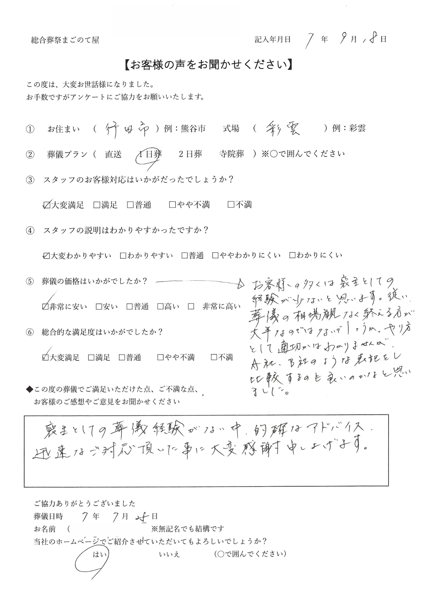 お客様(ご家族)に安心して葬儀に臨んでいただくため「納得のできる葬儀」をめざし、費用に対して少しでも不安が解消できるようにお客様に状況に合わせてご説明しています。